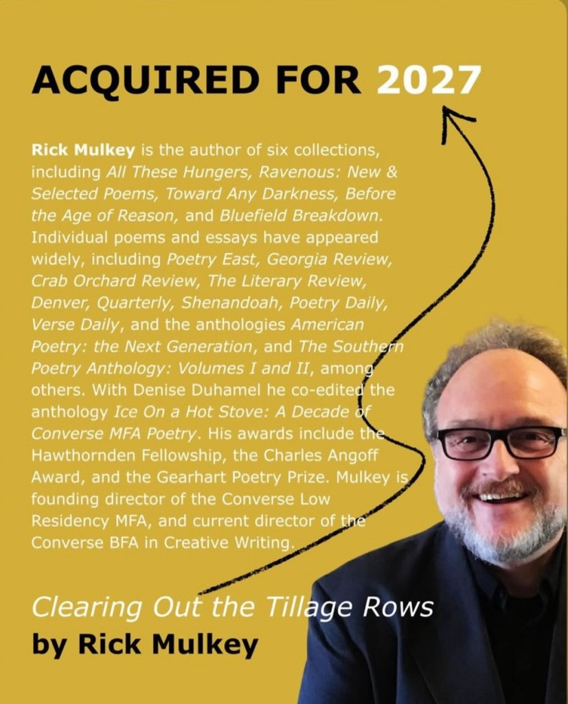 “Turn my hungers. Feed, hungers, in the meadows of sounds,” wrote our crazed surrealist French poet, Arthur Rimbaud, over one hundred years ago. Talented, candid, intellectually nimble, neither crazed nor surreal, Rick Mulkey turns on his hungers, turns Rimbaud into something American, small town scrappy, transparent and musky: these memorable poems land on the tongue and in the brain and center on the stomach. Whisky, beans, peppered pork belly bacon, lemonade, unclean scrambled eggs, very cold sweet tea, onions, beets, tomatoes, wine, beer — the poems overflow with juice. These poems celebrate sex – “the salty taste of the body’s hidden flesh” and excrement – “there’s the kind beetles roll into balls across the savannah.” These Rabelaisian poems have a nose for the ground that smells “like dusty clocks.” More Roethke than Whitman, more Hogarth than Gainsborough, this book’s gritty lyric excretes an aroma that lingers. This book honors what many lost in the world’s worst pandemic: taste and smell. —Spencer Reece